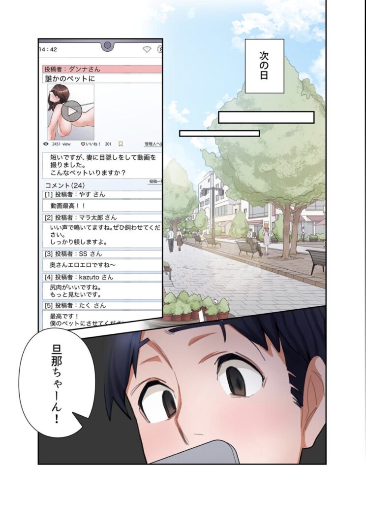 所員A「NTRの定番だけど、過程がしっかり描かれてて興奮する。画像投稿 → 説得して屋外フェラ → ラブホ複数プレイとエスカレートしていく流れが自然で、妻ちゃんの気持ちの変化がグッとくる」