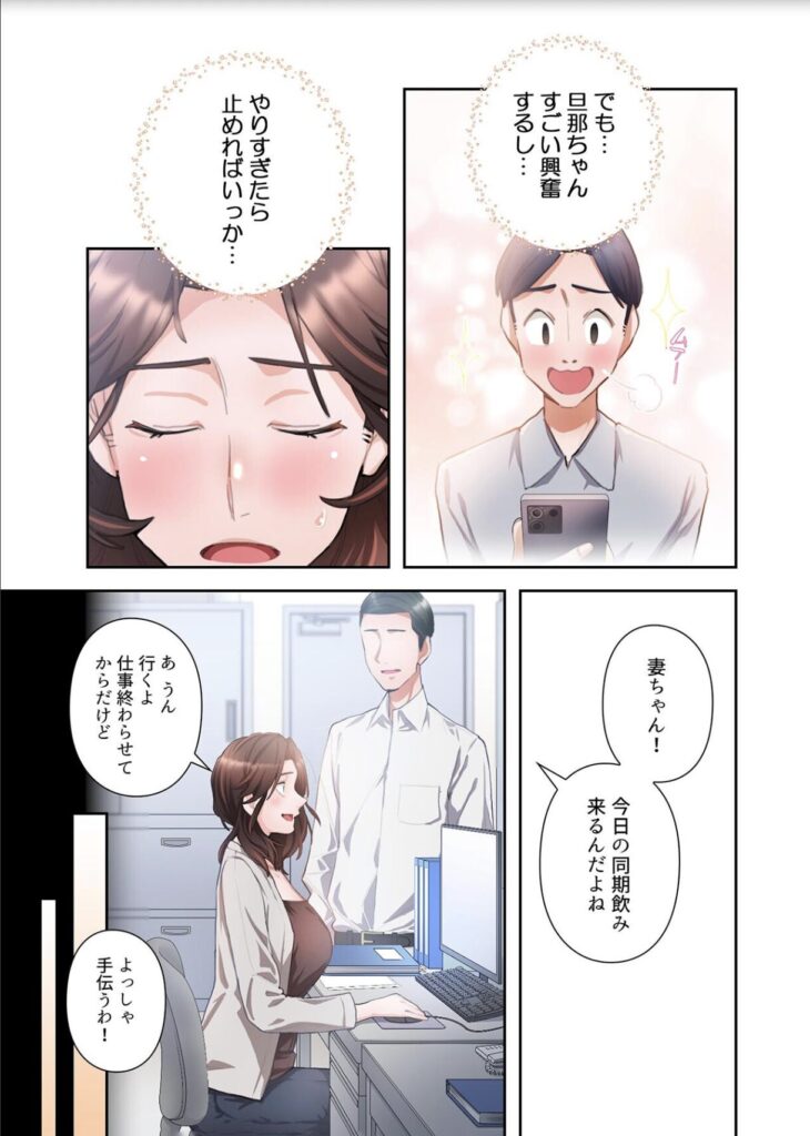 所員B「ストーリーは無難だけど面白い。夫のNTR願望と妻の変化が丁寧に描かれてて、今後のエスカレートに期待大。フルカラーだからこそ妻ちゃんの表情や肌の感じがリアルで興奮する」